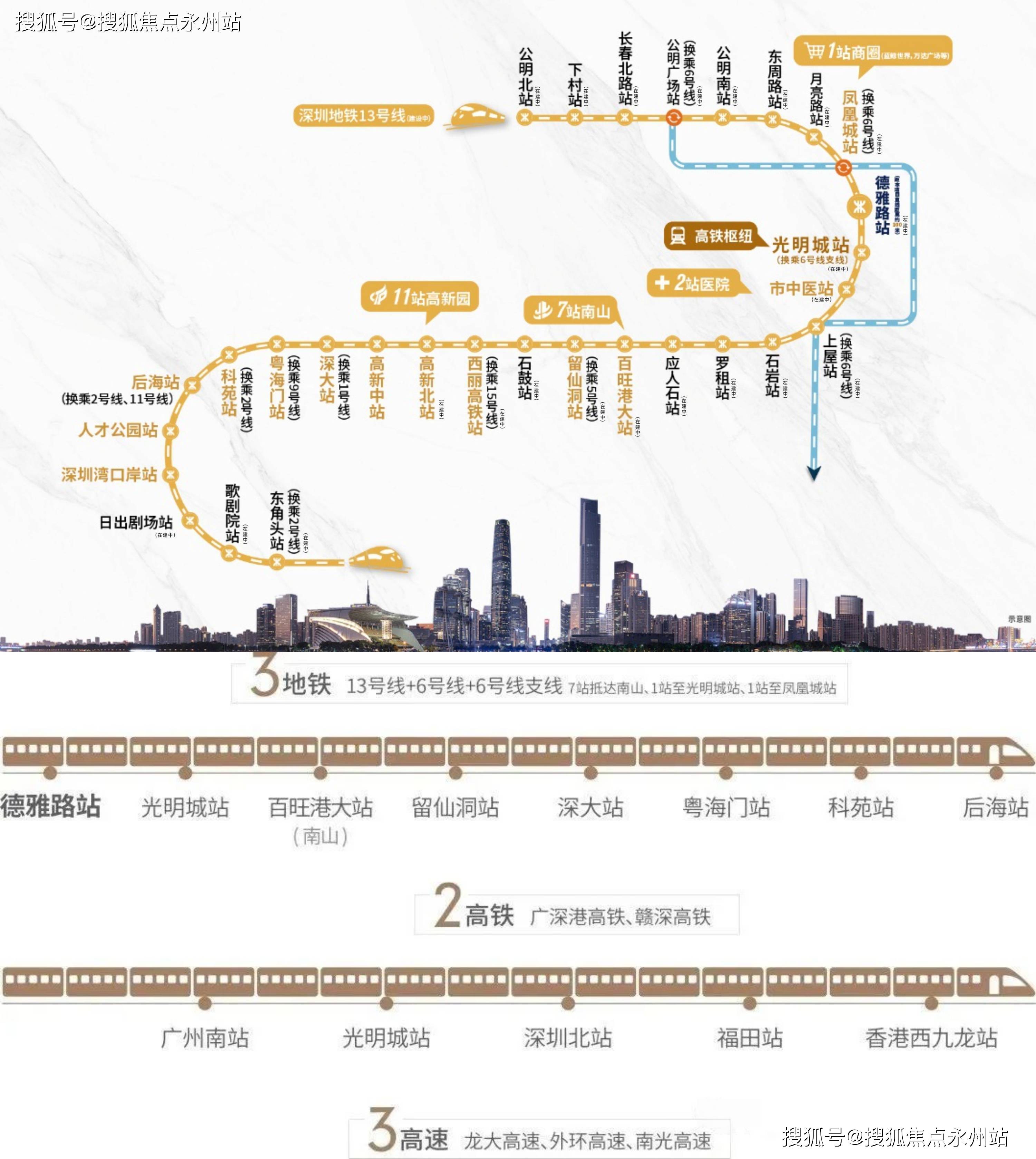 规划明确凤凰城定位为“科创融合先锋商务区”,未来将推动光明城站TOD 综合开发,构建“轨道+物业+产业”的发展模式,区域价值持续攀升。项目距离地铁13号线德雅路站(原同观路站)仅约100米,该线站可抵南山高新园,8站到留仙洞总部基地,11站至深圳湾口岸,实现南山、福田核心区30分钟通勤圈,临近地铁 6号线光明城站,可快速换乘至福田、罗湖等区域。