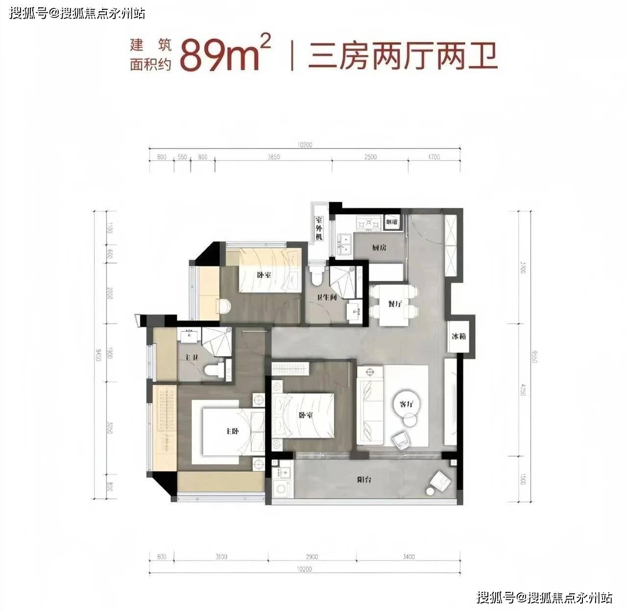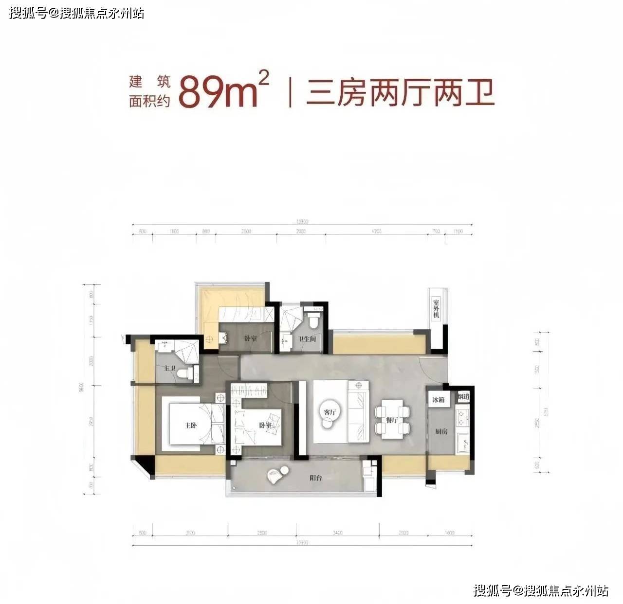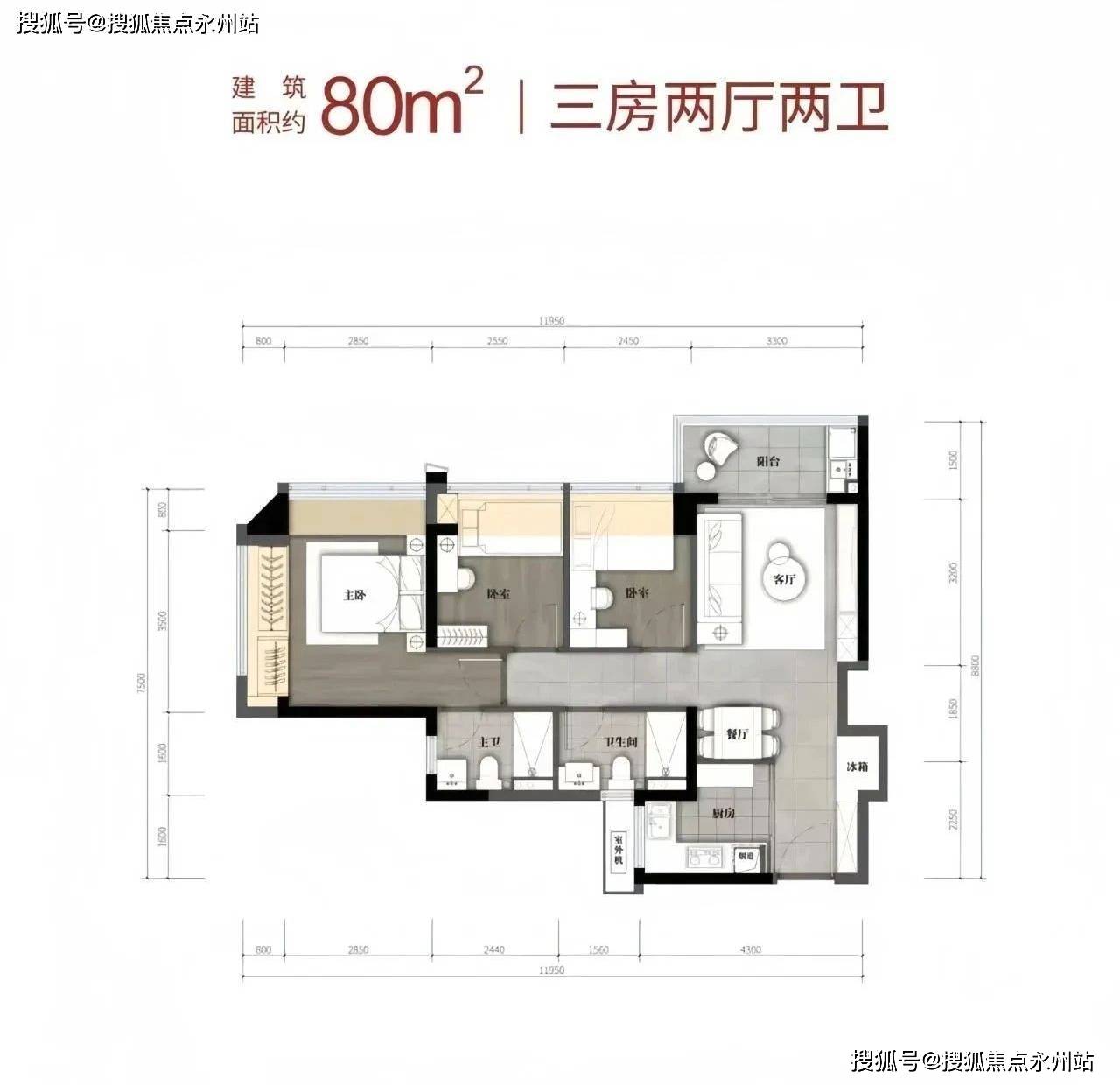 亮点:在有限面积内实现双卫配置,S型冰箱位优化厨房空间,全屋中央空调为标配。