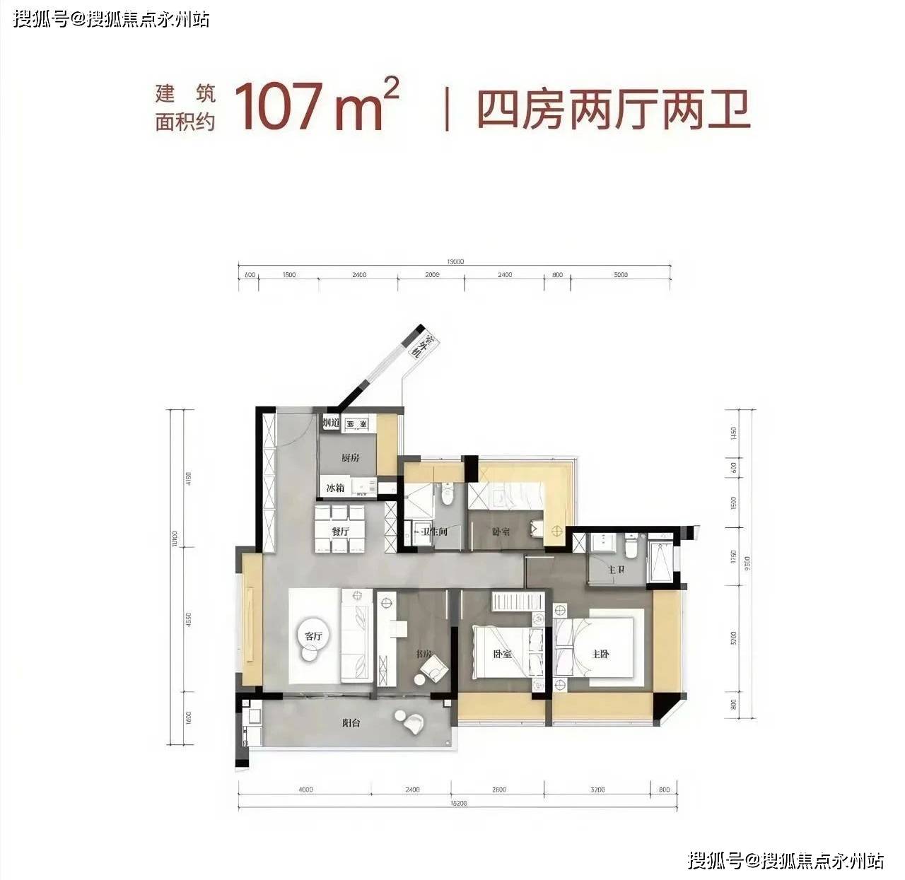 动静分区明确,LDKB(客厅、餐厅、厨房、阳台)一体化设计,客厅开间3.3米,连接4.9㎡景观阳台,主卧配备双飘窗及独立卫浴,次卧与书房可灵活调整功能。