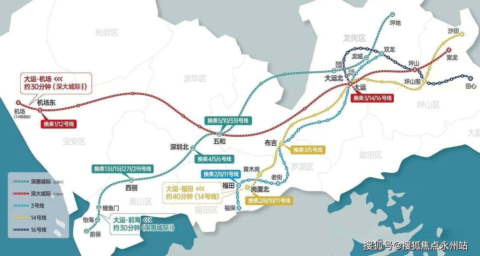 项目距离地铁16号线“大运中心站”约800米,步行约10分钟可达,1站可直达大运枢纽,无缝换乘3号线号线及建设中的深大城际,距离在建的深惠城际“大运北站”约1公里